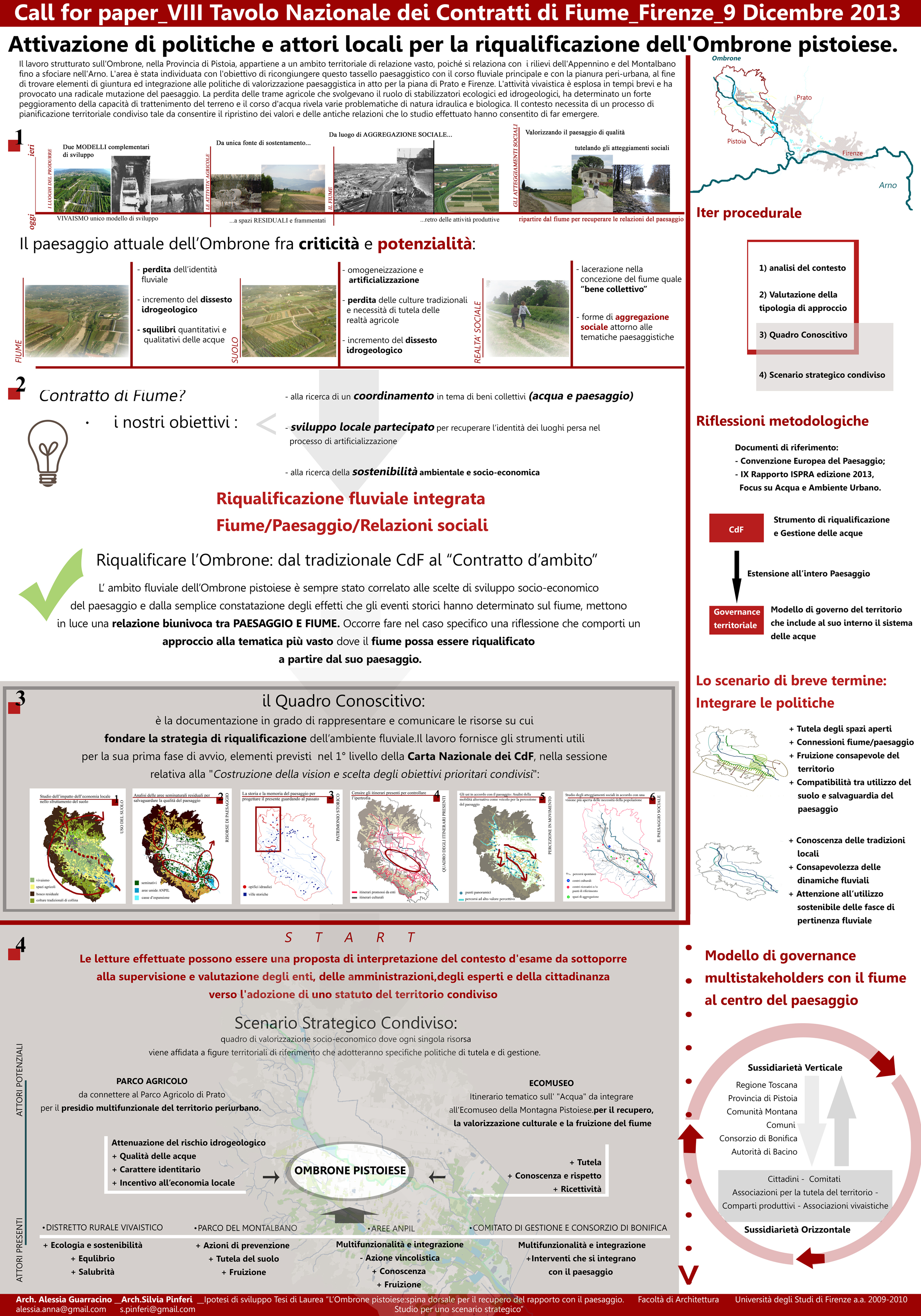A tre anni di distanza dalla “Carta Nazionale dei Contratti di Fiume (CdF)”: Regione Lombardia – Milano, V° Tavolo Nazionale 2010 e Regione Piemonte – Torino, VI° Tavolo Nazionale 2011 e ad un anno dal Position Paper sul “Green New Deal dei territori fluviali” (Regione Emilia Romagna – Bologna VII° Tavolo Nazionale 2012), i CdF hanno avuto una ulteriore e significativa accelerazione. Questa crescita è certamente correlata all'incalzare dell'attualità e al susseguirsi di eventi drammatici, legati all'aggravarsi del rischio idrogeologico, inquinologico, alle conseguenze del consumo di suolo ed in generale a tutte quelle criticità che per essere affrontate necessitano di strategie di prevenzione e processi di governance collettiva. In questo contesto i CdF si prefigurano come uno degli strumenti a disposizione del cambiamento e vista la diffusione che hanno avuto in termini quantitativi e qualitativi in questi ultimi anni, ci portano a sperare che in realtà il “cambiamento sia già in atto”. Dall'Osservatorio del Tavolo Nazionale dei Contratti di Fiume si registrano sempre nuovi processi in attivazione in tutte le Regioni ed una sempre maggiore capacità da parte dei CdF di integrare i piani e le norme sulla gestione e tutela delle acque con quelli per la difesa del suolo, del paesaggio e lo sviluppo economico dei territori. Con l'VIII Tavolo Nazionale di Firenze, si è puntato a continuare l'opera di circolazione di buone pratiche, già intrapresa nelle precedenti edizioni, fornendo al contempo un contributo al dibattito in corso sugli argomenti emergenti e di maggior rilevanza. Con questo nuovo appuntamento si è voluto contribuire a creare una visione condivisa e interregionale che consente di continuare a diffondere i Contratti di Fiume ed a sostenere gli investimenti nei territori fluviali che li adottano.